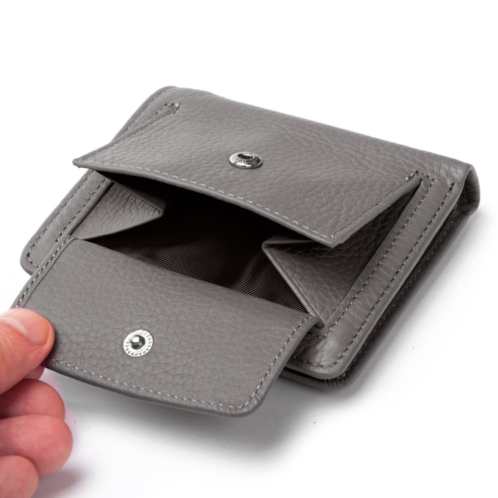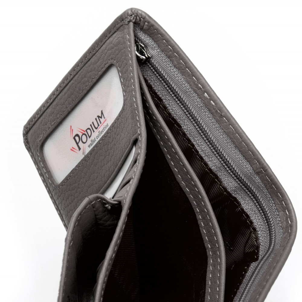 Количество отделений: 2 больших открытых отделения для банкнот (разделены кожаной перегородкой) и одно отделение на молнии. Также есть 12 карманов для визитных карт, 4 из которых выполнены прозрачными. Снаружи кошелька на обратной стороне есть монетница на кнопке.