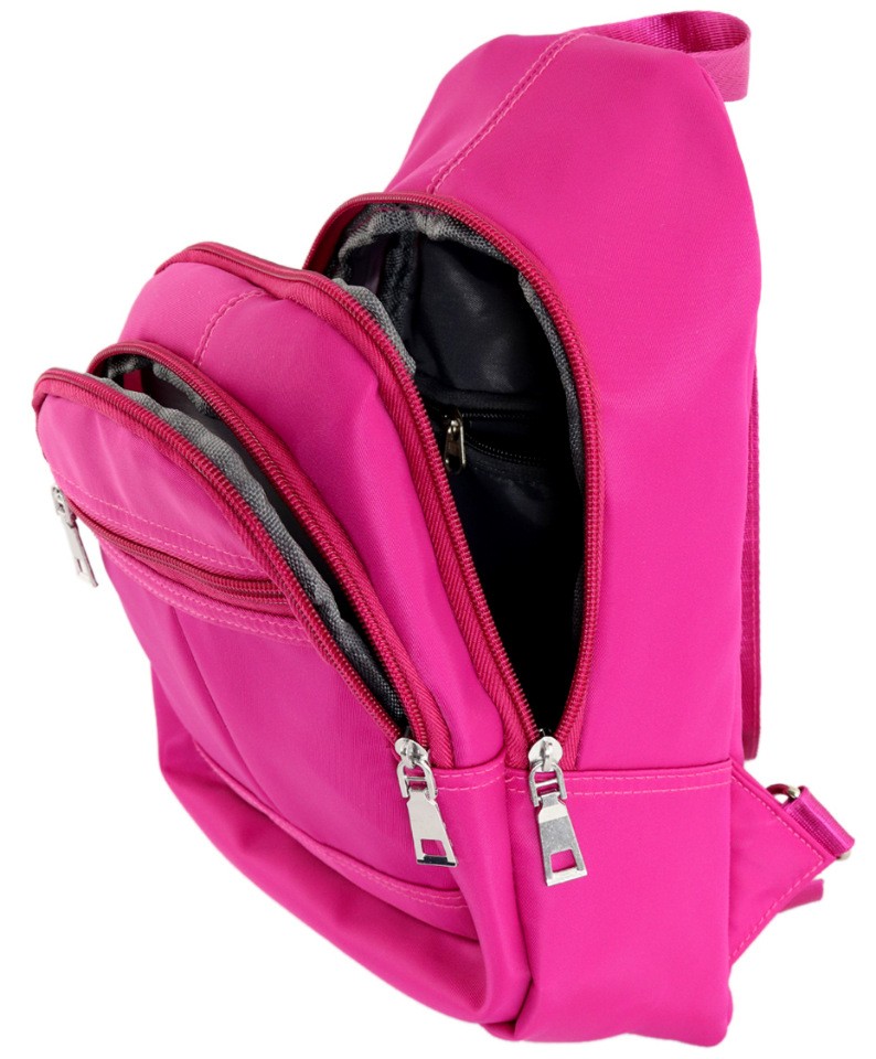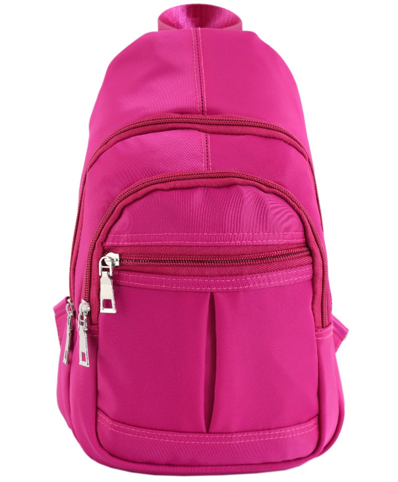 Рюкзак малинового цвета из плотного влагостойкого нейлона. Основное отделение на молнии, внутри кармашек. С внешней стороны 3 кармана на молнии. Уплотненная спинка, регулируемые плечевые ремни на карабинах, соединяются молнией.