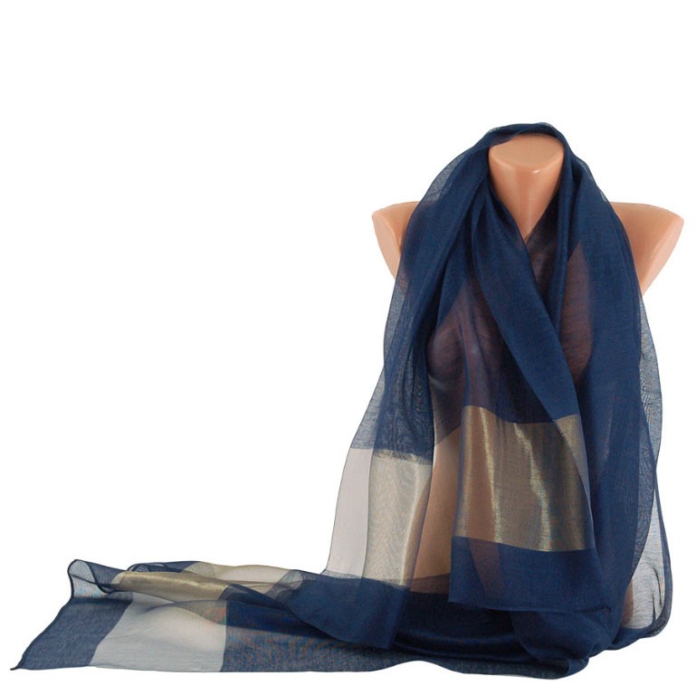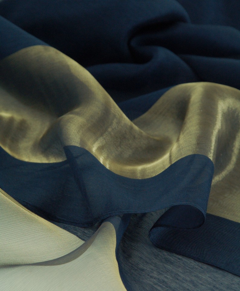 Легкий шелковый шарф тёмно-синего цвета с широкой полупрозрачной золотистой полосой.