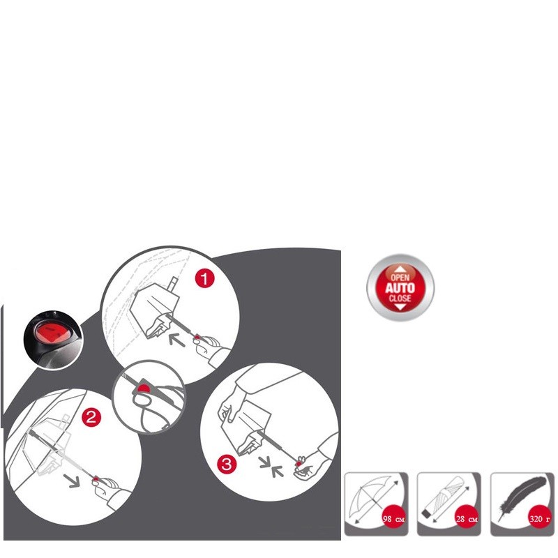 Механизм: полный автомат (конструктивные особенности такого зонта позволяют закрывать и открывать купол в полностью автоматическом режиме путём нажатия всего одной кнопки).